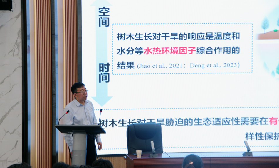 焦亮以《中亚优势针叶树木径向生长对干旱胁迫的生态适应机制研究》为题,从树木年轮对气候变化的响应入手,介绍了中亚地区不同空间区域、不同树种、不同树龄的树木年轮温度、降水变化的响应机理,并重点阐述了树木年轮作为重要研究手段,在研究长时间尺度下森林对气候变化响应机理方面所具备的优势,拓展了师生视野。