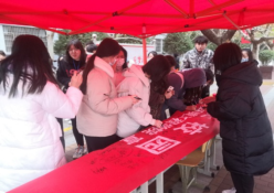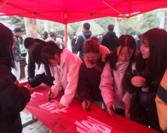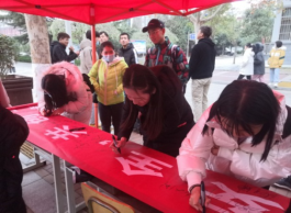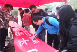过往的老师及同学热心参与,在横幅上签字表态“重视交通安全,共创平安校园”。